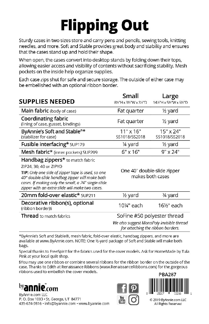 Sturdy cases in two sizes store and carry pens and pencils, sewing tools, knitting needles, and more. Soft and Stable™? provides great body and stability and ensures that the cases stand up and hold their shape. When open, the cases convert into desktop stands by folding down their tops, allowing easier access and visibility of contents without sacrificing stability. Mesh pockets on the inside help organize supplies. Each case zips shut for safe and secure storage. The outside of either case may be embellished with an optional ribbon border. The pattern includes complete step-by-step instructions for cases in two sizes.
