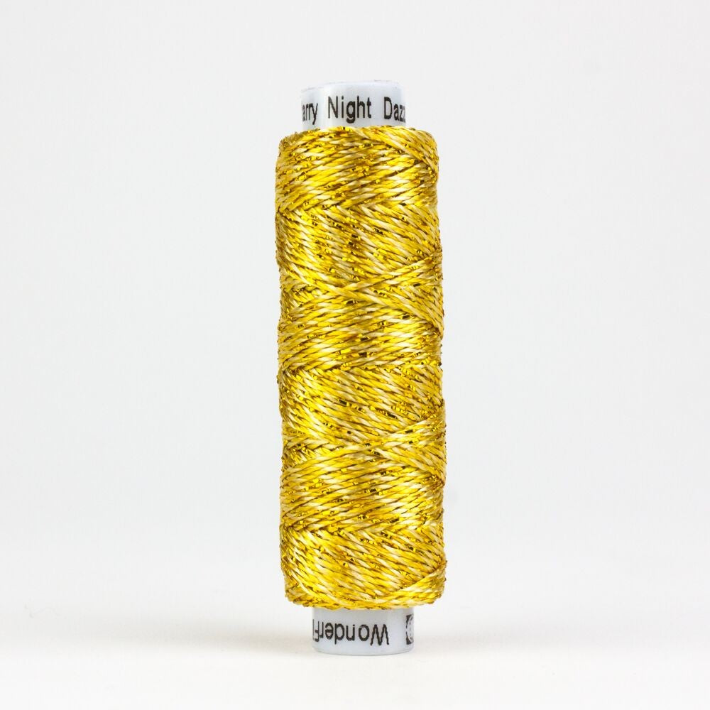 A sturdy 6-ply thread, Dazzle™ is comparable in weight to a #8 perle cotton. This is 100% rayon and metallic mix carries a naturally bright lustre with a silky finish, making it an excellent choice for crafts, crochet, knitting, and highlighting the details on dimensional stitches. Because of Dazzle's™ light reflective properties and "pop" of metallic, the detail on wool appliqué and layering can be enhanced with edging stitches for that extra sparkle.