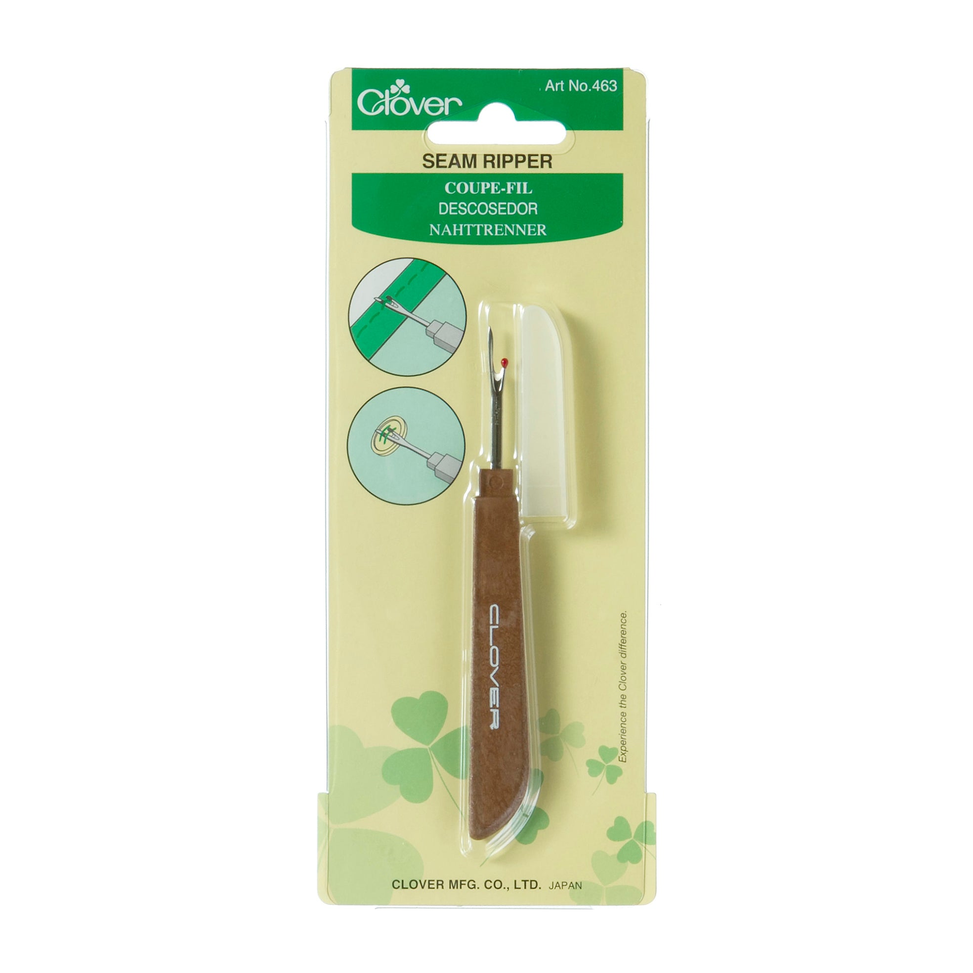 Clover Seam Ripper that easily cuts threads, has a Safety Cover and will allow you to get into the tiniest of stitches. Perfect for ripping out seams, hems, buttons, snaps, zippers and much more without damaging the fabric. Also useful for cutting threads and creating buttonholes. The small ball on the point will prevent damaging materials during use.