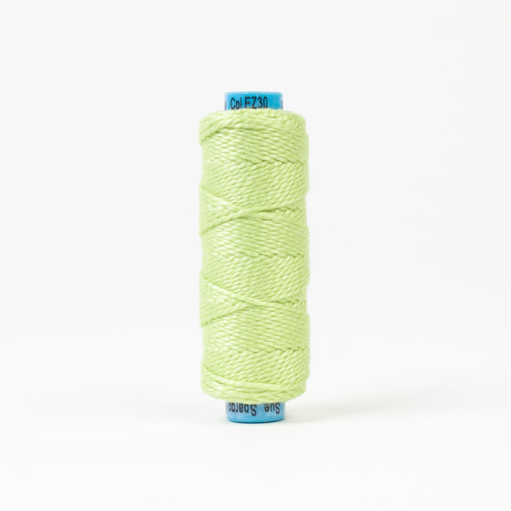 Sue Spargo's Eleganza Perle cotton collection is designed to meet the specific needs of hand stitchers, embroiderers and embellishers. Eleganza is made from 100% Giza 88, the highest calibre extra long staple Egyptian cotton. Fibers spun with this fiber create a thread of extreme softness, strength and luster. An extra 15% twist has been incorporated into the design of Eleganza resulting in a thread of superior stability, uniformity and sewability. Eleganza is double gassed and mercerized to eliminate the buildup of lint and snub, largely enriching the appeal of stitchery. Sue has designed a bright, saturated color palette along with a unique line of variegates which contain extra short variegations in order to provide rapid color change on small scale designs.