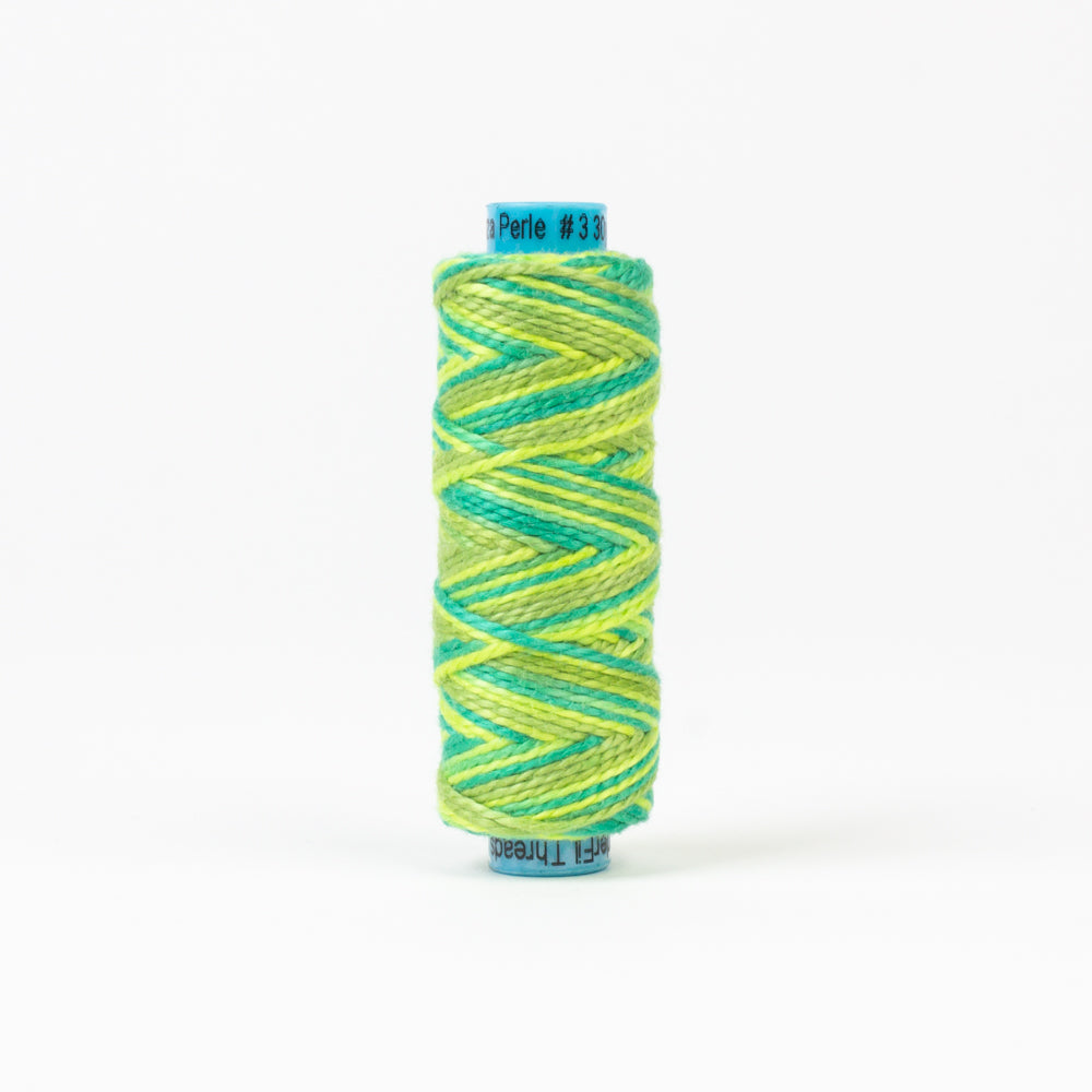 Sue Spargo's Eleganza Perle cotton collection is designed to meet the specific needs of hand stitchers, embroiderers and embellishers. Eleganza is made from 100% Giza 88, the highest calibre extra long staple Egyptian cotton. Fibers spun with this fiber create a thread of extreme softness, strength and luster. An extra 15% twist has been incorporated into the design of Eleganza resulting in a thread of superior stability, uniformity and sewability. Eleganza is double gassed and mercerized to eliminate the buildup of lint and snub, largely enriching the appeal of stitchery. Sue has designed a bright, saturated color palette along with a unique line of variegates which contain extra short variegations in order to provide rapid color change on small scale designs.